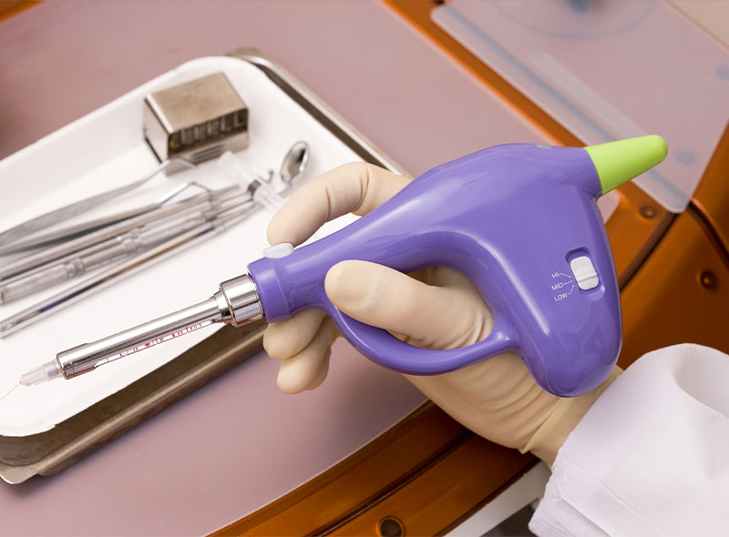 電動麻酔で痛みを軽減し、さらに表面麻酔を行うことで注射針を刺す痛みを和らげます。